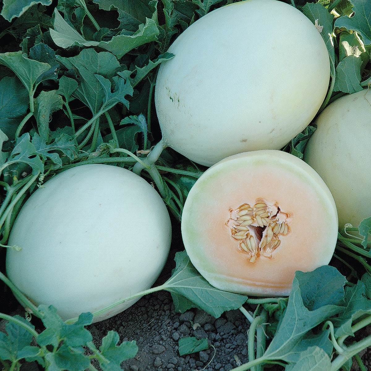 Fruit: (8-10 lbs.) This Honeydew melon has an ivory-green exterior with a lime green interior ring into orange flesh.